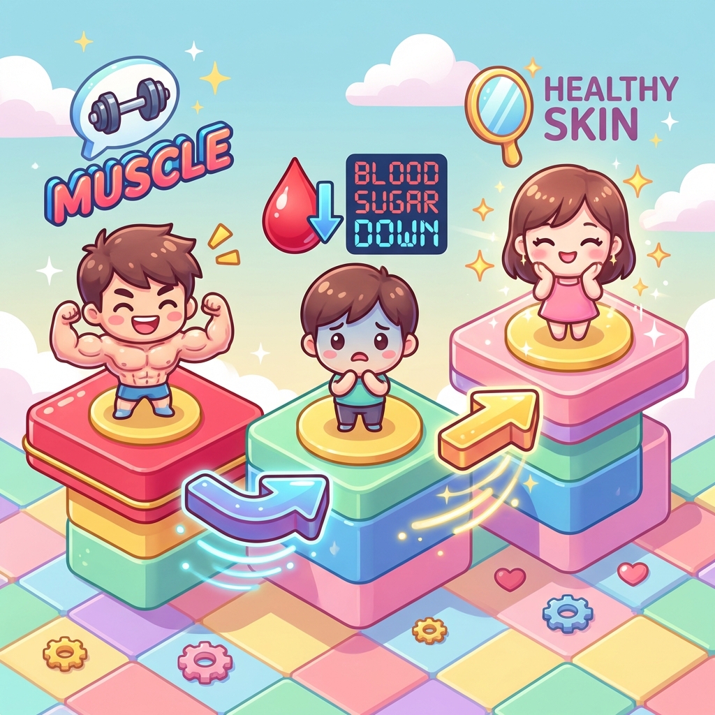- 혈당 관리가 곧 피부 관리: 높은 혈당이 만드는 '최종당화산물(AGEs)'이 피부 노화의 주범입니다.