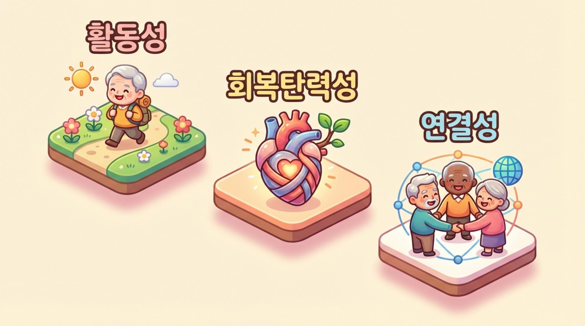 - 능동적인 활동: 사회활동, 여가, 소비를 주도적으로 즐기며 보람을 찾습니다.
